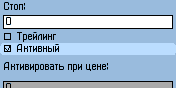Кнопки выбора работают как выключатель - имеют два положения - включено и отключено. На рис. далее показаны две кнопки выбора - "Трейлинг" и "Активный". Как видно из рисунка, кнопка "Трейлинг" неактивна, а кнопка "Активный" - активна, о чем свидетельствует "галочка", проставленная в кнопке. Переключение состояний выбранной кнопки выбора осуществляется нажатием на одну из кнопок вашего телефона - "Вправо", "Влево" или "Выбор".