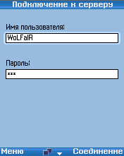 В полях этой формы вам необходимо ввести ваш логин и пароль. После ввода, нажмите на кнопку "Соединение" для того, чтобы соединиться с сервером используя введенные данные. Если данные были введены с ошибкой, приложение известит вас об этом и попросит ввести их заново. Логин и пароль сохраняются при последующих входах в систему.