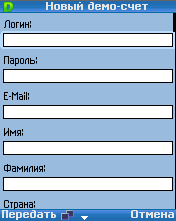 При регистрации демонстрационного счета вам дается 2500 виртуальных рублей. Работа на демонстрационном счете ничем не отличается от работы на реальном счете. Для регистрации демонстрационного счета в окне логина нажмите левой софт клавишей кнопку "Меню". Выберете "Новый демо-счет", и заполните следующие поля.