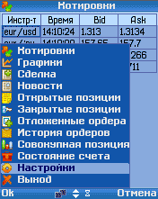 Меню, служит в основном для перехода между основными окнами приложения и вызывается из любого основного окна приложения по левой софт-клавише телефона . К этому добавлены еще два пункта - "Выход" и "Настройки". "Выход" позволяет завершить работу с приложением, а пункт "Настройки" позволяет настроить текущий экран.