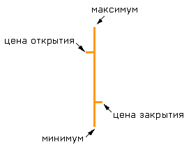 На графике каждый период обозначается вертикальной линией (представляющей собой диапазон колебания цен внутри периода), слева и справа от которой располагается по одной черте.