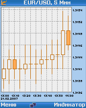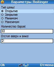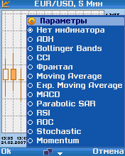 Выбор индикатора осуществляется нажатием на кнопку «Индикаторы» в окне графиков правой софт-клавишей мобильного телефона. Из появившегося меню вы можете выбрать нужный индикатор, или же изменить параметры текущего индикатора с помощью пункта меню «Параметры».