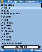 Войти в настройки графиков можно из главного меню (левая софт-кнопка вашего телефона, пункт меню «Настройки»). В этом окне вы можете выбрать тип графика (линейный, бары, свечи), масштаб, валютную пару, а также период обновления - периодичность, с которой сервер запрашивает новые данные для графиков. Чем больше период обновления, тем меньше трафика потребляет mobile forex.