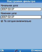 Так как таблица может иметь значительные объемы, предусмотрен фильтр по датам, вызываемый правой софт-клавишей телефона: