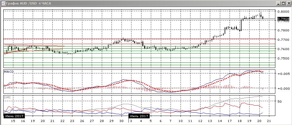 На четырёхчасовом графике похожая картина: последовательность роста относительных максимумов и минимумов пары не нарушена, но тенденция, кажется, выдыхается — гистограмма MACD снижается уже в отрицательной области, линия MACD развернулась вниз, но по ADX тенденция роста остаётся очень сильной. Также существенно, что образуются свечи «дожи» - в этом можно предполагать нарастание неуверенности в продолжении тенденции. При снижении ниже уровня 0,7900 произошёл бы разворот, тогда целью отката виделся бы уровень 0,7800 как следующий «круглый» уровень и поддержка 17-18 июля.