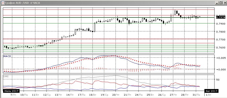На четырёхчасовом графике пара консолидируется ниже 0,8000. Рост до 0,8070 может быть рассмотрен как ложный пробой. Исходя из этого, более вероятным видится снижение пары до уровня нижней границы канала в этом масштабе 0,7900. По индикаторам направленного движения в этом масштабе флэт.
