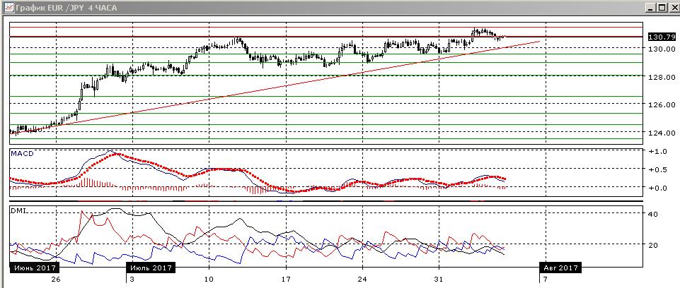На четырёхчасовом графике пара вернулась к ранее преодолённому уровню сопротивления на 130,80. Если пара останется выше этого уровня, то скорее откат можно будет рассматривать как консолидацию перед дальнейшим ростом пары. По индикаторам направленного движения явной тенденции нет. Последовательность роста относительных максимумов и минимумов пары не нарушена, тенденция сохраняется.