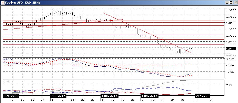На дневном графике пара достигла более высокого относительного максимума, чем предыдущий — это подтверждает версию о развороте вместе с преодолением нисходящей линии тренда с июня. Гистограмма MACD растёт в положительный зоне, линия MACD получила положительный наклон. По ADX тенденция снижения становится менее сильной (DM- и DM+ сближаются). Пока пара выше линии нисходящего тренда и выше уровня 1,2400, где образовалась база для отскока в конце июля, продолжение роста кажется более предпочтительным, даже если это будет в рамках коррекции к снижению. При образовании свечи снижения в пятницу может образоваться разворотная комбинация с «падающей звездой», и возвращение к линии тренда.