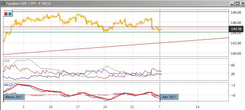 На четырёхчасовом графике пара продолжает снижение после резкого движения вниз 3 августа. Отскок вверх был ограничен уровнем сопротивления 145,00, который ранее выступал поддержкой для пары и был близок к промежуточному минимуму двойной вершины около 148,00. Консолидация ниже уровня поддержки предполагает, что снижение скорее продолжится, до линии тренда (она сейчас около 142,00) существенной поддержки не видно.