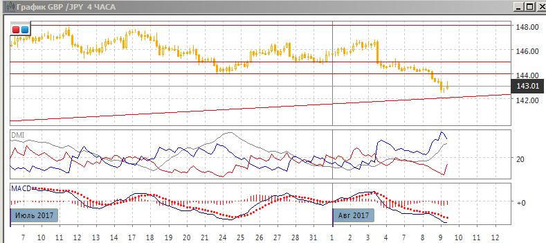 На четырёхчасовом графике снижение стало сильной тенденцией: превышение DM- над DM+ большое при росте ADX, гистограмма MACD остаётся в отрицательной зоне, хотя перед линией тренда снижение замедлилось и образовалось бычье расхождение минимумов пары и гистограммы MACD. Последовательность снижения относительных максимумов и минимумов пары не нарушено, и отскок от 142,50 не развивается. Скорее, снижение пары возобновится с ближайшей целью на 142 (около линии тренда).