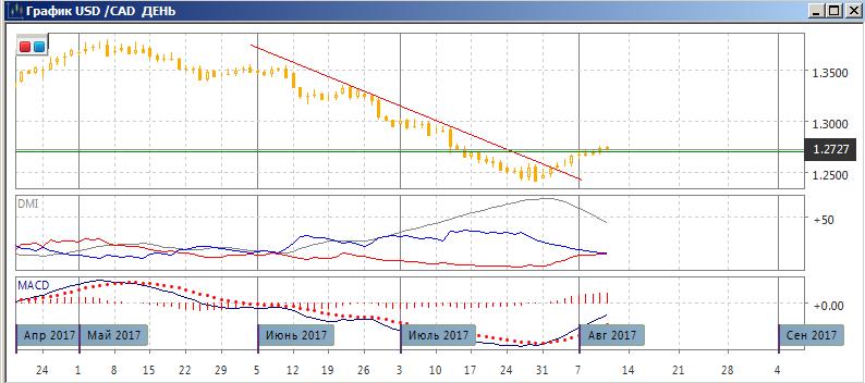 На дневном графике было закрытие выше сопротивления на 1,2700. После образования свечей «дожи» это показывает, что пара переходит к продолжению роста, а не к откату. Продолжение роста кажется предпочтительным, так как все свечи от 124,00 растёт — это похоже на устойчивую волну наблюдавшегося в июле снижения. По ADX тенденции роста уже нет: DM- и DM+ сравнялись. По гистограмме MACD и линии MACD пара растёт. Целью видится уровень 1,3000 — это ближайший сильный обоснованный уровень сопротивления, как с психологической точки зрения, так и потому что он был сопротивлением в начале июля.