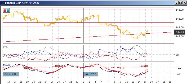 На четырёхчасовом графике пара перешла к росту: относительные максимумы и минимумы пары растут, по индикаторам направленного движения пара перешла к росту. DM+ выше DM-, гистограмма MACD перешла к росту в положительной зоне. Однако к волне снижения от 147,00 текущий отскок остаётся коррекционным. И скорее будет возвращение пары ниже уровня линии тренда и ниже уровня 142,00, что обозначило бы разворот текущего роста и завершение коррекции с возвращением с исходному уровню около 141,20.