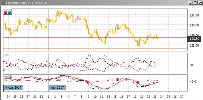 На дневном графике пара остаётся выше предыдущего минимума (и уровня поддержки на 128,15), однако после образования двух «молотов» дальнейшего движения вверх не происходит, и это скорее медвежий сигнал. С конца июля относительные максимумы и минимумы пары последовательно снижаются. По индикаторам направленного движения тенденцией является снижение - DM- выше DM+, гистограмма MACD пара остаётся в отрицательной области, линия MACD имеет отрицательный наклон. Учитывая,что отскок завершается, скорее уровень 128,15 будет вновь тестироваться, немного более отдалённая цель — уровень поддержки на 127,60.