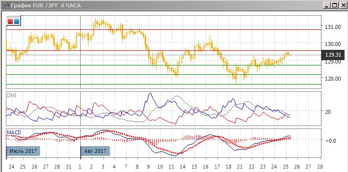 На четырёхчасовом графике тенденция изменилась после того, как из консолидации ниже 129,00 пара вышла не вниз (что было бы естественным для завершения коррекционного движения), а вверх. Относительные минимумы пары продолжают расти. По индикаторам направленного движения пара перешла к росту: DM+ немного выше DM-, гистограмма MACD находится в положительной зоне, линия MACD имеет положительный наклон. Так как пара достигла следующего уровня сопротивления, сейчас рассчитывать на рост рискованно из-за высокой вероятности отката (пара снижалась от этого уровня в середине августа).