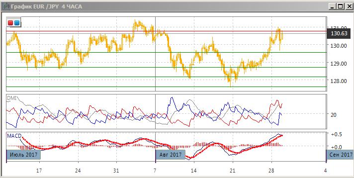 На четырёхчасовом графике последовательный рост относительных максимумов и минимумов от 127,60 продолжается, если не учитывать краткосрочный прокол ниже уровня поддержки 130 на сообщении о запуске северокорейской ракеты над территорией Японии в азиатскую сессию. По большей части снижение уже отыграно, и скорее рост продолжится — целью видится уровень 131,00 (дневной максимум). По индикаторам направленного движения тенденцией остаётся рост: DM+ выше DM-, гистограмма MACD находится в положительной зоне, линия MACD имеет положительный наклон.