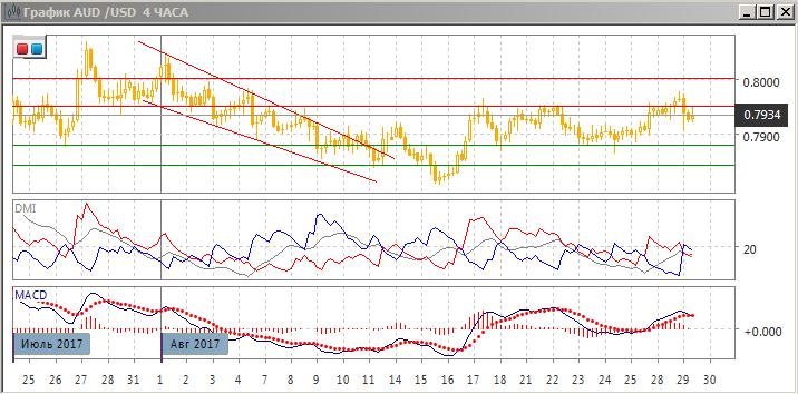 На четырёхчасовом графике вышла из канала 0,7880-0,7950 до сообщения о запуске северокорейской ракеты в азиатскую сессию, что привело к возвращению пары в канал. Так как эта новость, скорее, не будет иметь продолжения, что вероятно возвращение в ситуацию до неё — то есть выше 0,7950 и это делает предпочтительным дальнейшее движение пары вверх после консолидации выше уровня сопротивления (от него был разворот 17 и 21-22 августа). Если пара остаётся ниже 0,7950, более предпочтительным видится возвращение к нижней границе на 0,7880.