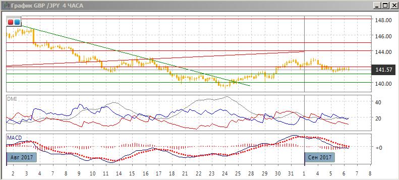 На четырёхчасовом графике происходит разворот вниз. Пара достигла более низкого минимума,чем предыдущий, идёт консолидация в узком диапазоне ниже 142,00, ранее это уровень поддержки. Скорее, снижение пары будет продолжаться с целью на 140,00, как ближайшему за 141,00 уровню поддержки. В рамках текущей консолидации между 141 и 142 стоит ожидать снижения к нижней границе, так как верхняя достигнута. По индикаторам направленного движения тенденцией является снижение: DM- выше DM+, гистограмма MACD остаётся в отрицательной зоне, линия MACD сохраняет отрицательный наклон.