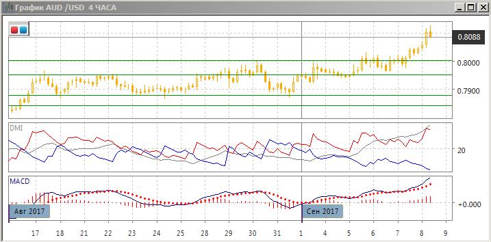 На четырёхчасовом графике рост ускорился после прорыва уровня 0,8000. В этом масштабе расхождений нет, и тенденция роста по индикаторам направленного движения также усиливается: превышение DM+ над DM- очень большое, ADX на высоком уровне и растёт. Гистограмма MACD растёт в положительной зоне, линия MACD имеет положительный наклон. Рост относительных минимумов пары продолжается. Скорее, рост продолжится даже в случае возможного отката. Так как ключевой уровень сопротивления преодолён и пара на долгосрочном максимуме, то сильных уровней сопротивления близко не видно.