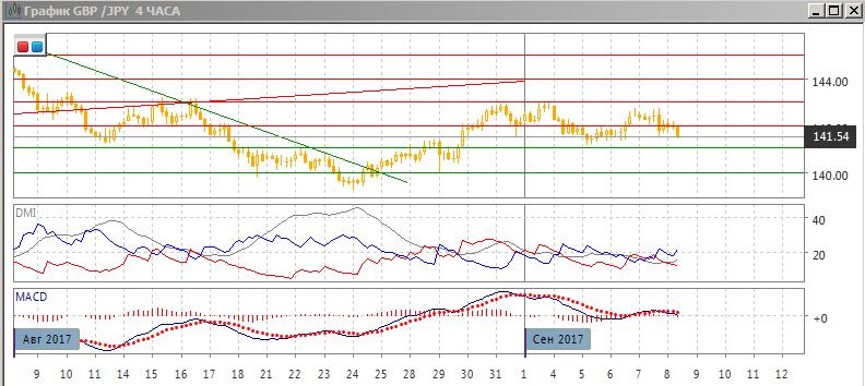 На четырёхчасовом графике краткосрочным каналом является 141,50-143,00. Индикаторы направленного движения показывают отсутствие тенденции. В рамках движения в диапазоне пара достигла нижней границы. Если будет выход из диапазона вниз, целью измеренного движения становится уровень 140 (движение в 150 пунктов равное ширине диапазона).