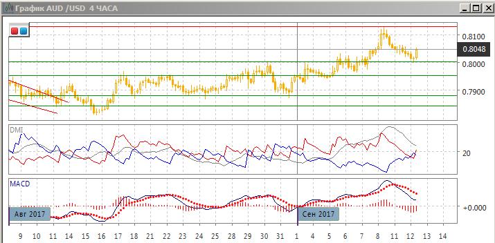 На четырёхчасовом графике выше уровня 0,8000 образуется разворотная свечная комбинация с «молотом». Это предполагает, вместе с сильным уровнем поддержки / сопротивления на 0,8000, что разворот более вероятен на данный момент. По ADX пера не перешла к снижению: DM+ и DM- равны. Коррекционное движение к уровню 0,8000 показывал разворот линии MACD и снижение гистограммы MACD, но последняя начала расти — что также скорее в пользу разворота от 0,8000. Целью движения вверх видится уровень предыдущего максимума около 0,8130.
