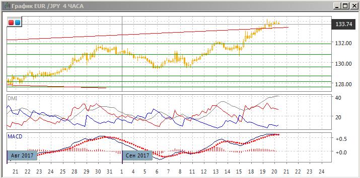 На четырёхчасовом графике имеется медвежье расхождение максимумов пары и гистограммы MACD, что говорит о замедлении тенденции и увеличении вероятности отката. По ADX в этом масштабе тенденция очень сильная — превышение DM+ над DM- очень большое, ADX находится на высоком уровне и растёт. Сопротивлением сейчас выступает уровень 134,00. Уровень тестировался 19 и 20 сентября. Пока пара выше линии тренда (верхней границы треугольника) продолжение роста кажется предпочтительным.