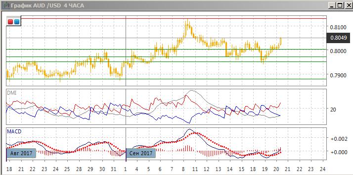 На четырёхчасовом графике пара достигла предыдущих максимумов 15 и 18 сентября около 0,8035, близко сопротивление на 0,8050. Пара растёт от 0,7950, и по индикаторам тенденцией становится рост: DM+ выше DM-, гистограмма MACD растёт в положительной зоне, линия MACD получила положительный наклон, но тенденция остаётся слабой (ADX на низком уровне). Важным сейчас видится устойчивость уровня 0,8050 — в случае преодоления этого уровня, открывается дорога к максимуму 8 сентября на 0,8130.