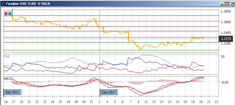 На дневном графике было закрытие выше уровня 1,2200. Однако в целом рост пары остаётся в рамках коррекции к снижению пары от ниже 1,2800. Такая ситуация будет сохраняться, пока пара ниже 1,2415 (уровня минимумов июля), который был преодолён в начале сентября. Исходя из представления о том, что текущий рост является коррекционным, целью видится уровень 1,2060 — откуда начался отскок пары в сентябре. По индикаторам направленного движения сохраняется ситуация коррекции к снижению: превышение DM- над DM+ сохраняется, коррекция видна по росту гистограммы MACD.