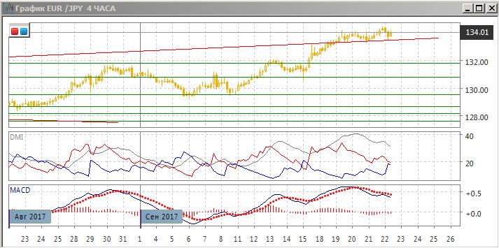 На четырёхчасовом графике, напротив, разворот видится возможным: медвежье расхождение максимумов пары и гистограммы MACD стало уже тройным. Последовательность роста относительных максимумов и минимумов пары не нарушена, и пара получила поддержку на линии верхней границы треугольника. Её преодоления и преодоление предыдущего минимума около 133,30 можно обозначить разворот. Однако пока пара выше границы треугольника, рассчитывать на снижение преждевременно. По индикаторам направленного движения тенденции роста уже нет: DM+ и DM- близки, гистограмма MACD находится в отрицательной зоне, линия MACD имеет отрицательный наклон. При преодолении уровня 133,30 целью может быть зона у 132,00 (максимумы конца августа и середины сентября).