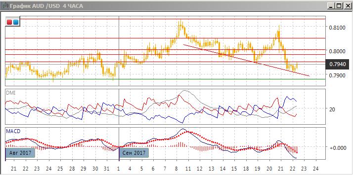 На четырёхчасовом графике происходит остановка после сильного снижения от 0,8100. Текущий отскок выглядит коррекционным к снижению, и ближайшее сопротивление видится на 0,7950 (ранее преодолённый уровень поддержки). Отскок может поддержать то, что пара выросла от одного из вариантов снижающейся линии поддержки, если строить её с середины сентября. Однако более вероятно, что снижение возобновится после коррекции. По индикаторам направленного движения тенденцией стало снижение: DM- существенно выше DM+ при росте ADX, гистограмма MACD снижается в отрицательной области, линия MACD имеет отрицательный наклон.