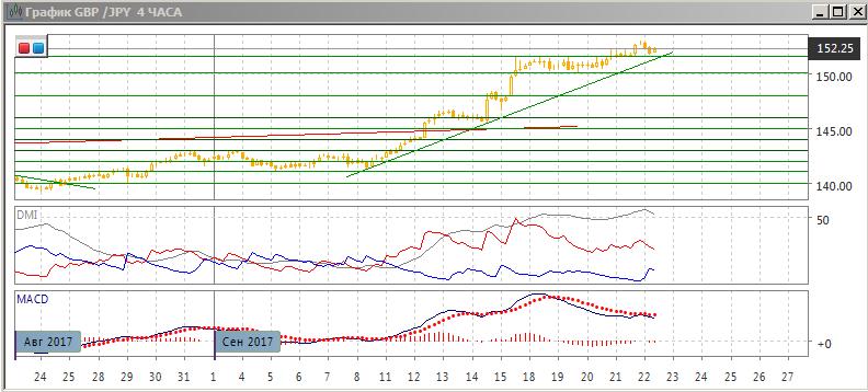 На четырёхчасовом графике также тенденция остаётся сильной, но увеличивается вероятность снижения: образовалось медвежье расхождение максимумов пары и гистограммы MACD. Возвращение пары ниже уровня 151,50 может создать ситуацию ложного пробоя вверх. Кроме этого, снижение ниже 151,50 привело бы к преодолению краткосрочного восходящего тренда, построенного по минимумам с 8 сентября. Пока пара выше 151,50 продолжение роста видится предпочтительным.