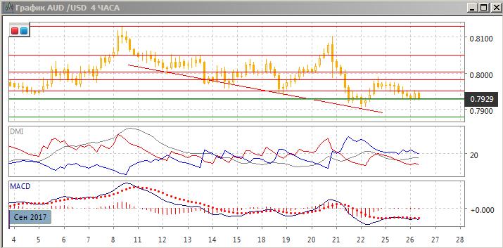 На четырёхчасовом графике после коррекционного движения от линии поддержки, проведённой по минимумам с 12 сентября, движение вверх остановилось на 0,7980, откуда началось снижение. Пара вновь преодолела уровень 0,7950, и сейчас он выступает сопротивлением сверху. Предпочтительным видится продолжение снижения до приближения к 0,79000 (около минимума 22 сентября). По ADX тенденцией является снижение — DM- выше DM+.
