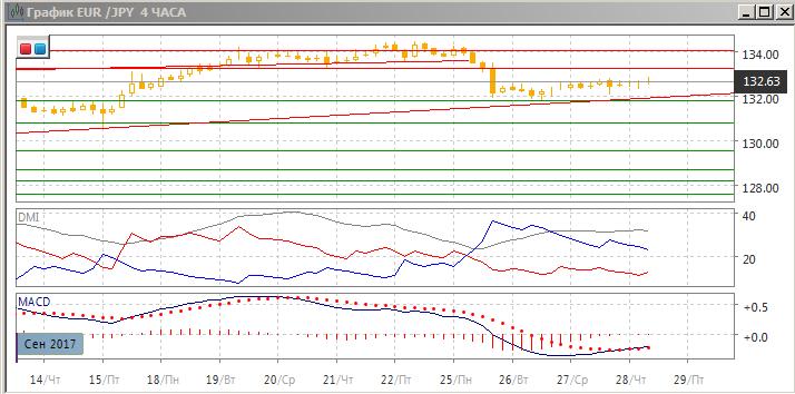 На четырёхчасовом графике происходит, наоборот, коррекция к снижению пары до 131,80. Рост пары от 131,80 происходит медленно, уровень пары повысился не сильно, несмотря на период роста, близкий к периоду снижения ранее (22-25 сентября). По индикаторам направленного движения коррекция к снижению: превышение DM- над DM+ сохраняется, гистограмма MACD растёт и достигла положительной зоны, линия MACD получила наклон. Возобновление снижения кажется предпочтительным, с первичной целью на 131,80.
