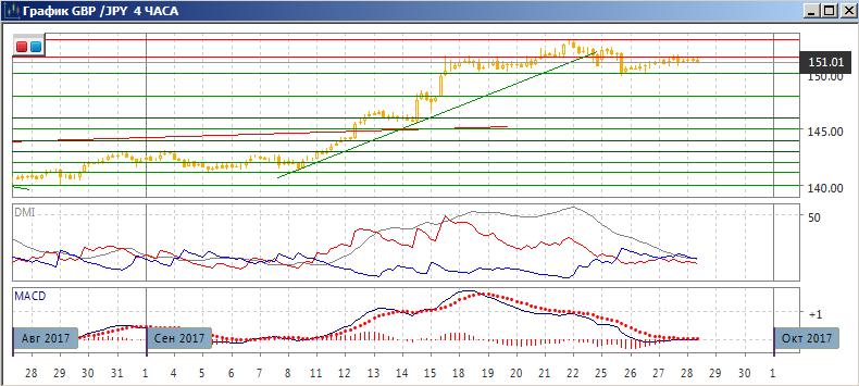 На четырёхчасовом графике рост пары от 150,00 приостановился ниже 151,50 (на верхней границе ранее действовавшего с середины сентября диапазона). По индикаторам направленного движения в этом масштабе сейчас флэт: DM+ и DM- близки при низком уровне ADX, гистограмма MACD около нуля, линия MACD горизонтальна. Пока пара ниже 151,50, возвращение к 150,00 кажется предпочтительным (исходя из движения в диапазоне). Относительные максимумы и минимумы пары от 153,00 снижаются.