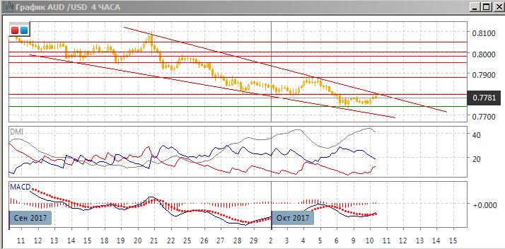 На четырёхчасовом графике происходит отскок вверх, который приостановился ниже уровня 0,7800. Пара приблизилась к сильному уровню сопротивления, с другой точки зрения она приблизилась к нисходящей линии тренда, что укрепляет сопротивление в этой зоне. По ADX тенденцией остаётся снижение: превышение DM- над DM+ сохраняется. Более вероятным видится возобновление снижения. Целью видится зона у 0,7700 — около этого уровня нижняя граница нисходящего клина, если строить его с середины сентября.