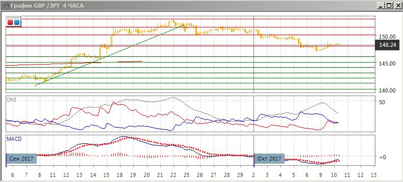 На четырёхчасовом графике отскок вверх приостановился около 148,00 — здесь образуются свечи «дожи». Далее видится два варианта: при закреплении пары выше 148,00 возвращение к следующему уровню сопротивления на 150,00 (минимумы середины-конца сентября, максимума начала октября), или при возвращении пары ниже 148,00 продолжение снижения. Пара находится сейчас около предыдущего относительного максимума, и дальнейшее движение выше нарушило бы последовательность их снижения.