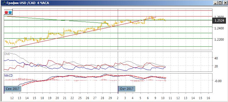 На четырёхчасовом графике, однако, видно замедление роста и даже возможный разворот после того, как пара снова снизилась ниже линии восходящего тренда с середины сентября. Последний относительный максимум был ниже предыдущего, и сейчас пара находится около предыдущего относительного минимума. Снижение ниже поддержки на 1,2535 привело бы более низкому минимуму и развороту последовательности. По индикаторам направленного движения тенденция меняется: DM+ и DM- пересеклись, гистограмма MACD в отрицательной области, линия MACD имеет отрицательный наклон.