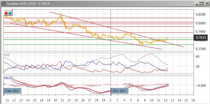 На дневном графике разворота снижения не было, однако существенным является, каково будет закрытие в четверг. Если рост сохранится, то это будет закрытие выше уровня сопротивления 0,7800 (который ранее был преодолён и выступал сопротивлением для пары) и выше линии нисходящего тренда (верхней границы клина), если строить его с середины сентября. Это открыло бы дорогу для дальнейшего роста пары. Последовательность снижения относительных максимумом и минимумов пары не нарушена (это произошло бы при преодолении 0,7880). По индикаторам направленного движения тенденция снижения сохраняется: превышение DM- над DM+ устойчивое, гистограмма MACD остаётся в отрицательной зоне, линия MACD имеет отрицательный наклон. Продолжение снижения остаётся предпочтительным в целом, но в краткосрочной перспективе более вероятным видится продолжение отскока, если пара удержится выше 0,7800 (с возможной целью на 0,7880).