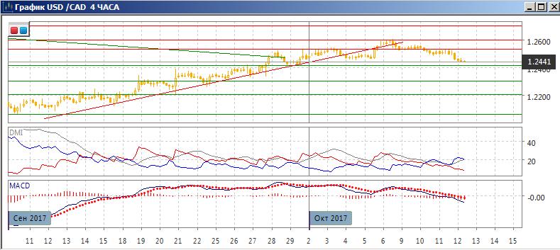 На четырёхчасовом графике пара перешла к снижению: относительные максимумы и минимумы пары от 1,26 снижаются, пара уже ниже минимумов 4-5 октября, что делает следующей целью важный уровень поддержки на 1,2415. По индикаторам направленного движения тенденцией становится снижение: превышение DM+ над DM- увеличивается при росте ADX, гистограмма MACD находится в отрицательной зоне, линия MACD сохраняет отрицательный наклон. Далее за 1,2415 снижение возможно только после преодоления этого уровня.