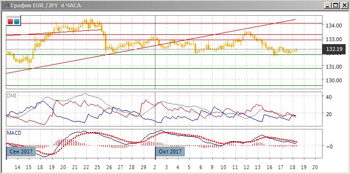 На дневном графике пара снизилась до уровня поддержки на 131,80, и осталась выше этого уровня. Так как отскок вверх закончился, и пара достигла уровня предыдущих минимумов, то более вероятным видится возобновление снижения, так как пара остаётся ниже линии тренда, проведённого по минимумам с середины августа. Ио индикаторам направленного движения снижение предпочтительно: гистограмма MACD в отрицательной зоне, линия MACD сохраняет отрицательный наклон.