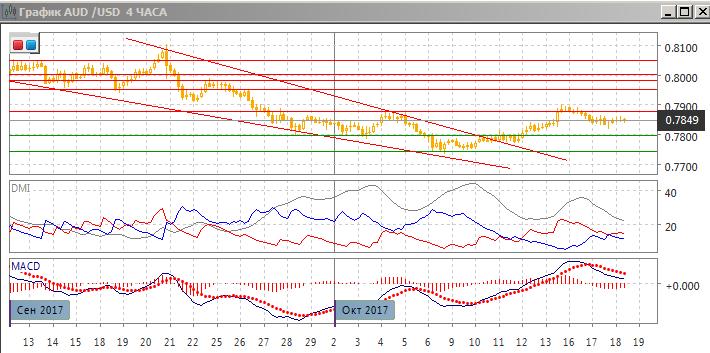 На дневном графике после выхода из «клина» с начала сентября и преодоления верхней границы — линии нисходящего тренда с середины сентября пара остаётся выше этой линии тренда. После закрытия выше уровня 0,7880, и выше предыдущего относительного максимума, произошёл откат, он он не был развит, и пара остаётся выше ближайшего круглого уровня поддержки на 0,7800. Образование свечей «дожи» скорее говорит о том, что коррекционное движение к росту заканчивается и более вероятно возобновление роста пары.