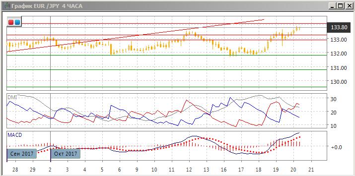 На четырёхчасовом графике пара перешла к росту после консолидации выше 131,80. Она преодолела максимум 12 октября. По индикаторам направленного движения тенденцией является рост: DM+ выше DM-, гистограмма MACD находится в положительной зоне, линия MACD имеет положительный наклон. Замедление роста перед 134,00 видно по снижению гистограммы MACD, что осложняет преодоление этого уровня. В текущих условиях может продолжиться боковое движение в границах 131,80-134,00, и в этом случае более вероятным также видится снижение.