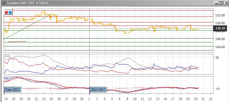 На четырёхчасовом графике продолжается консолидация в границах 148,00 — 149,15. В рамках движения в горизонтальном канале более предпочтительно возвращение к верхней границе на 149,15. По индикаторам направленного движения в этом масштабе также флэт.