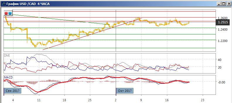 На дневном графике пара остаётся между сопротивлением на 1,2600 и поддержкой на 1,2415. Пока текущая консолидация сохраняется. Образование разворотной свечной комбинации с «падающей звездой» 17 октября не привело к развитию снижения даже до уровня поддержки на 1,2415 — пара вернулась примерно в середину диапазона. По индикаторам направленного движения флэт: DM- и DM+ близки, гистограмаа MACD остаётся около нуля, линия MACD горизонтальна. В рамках движения в диапазоне предпочтителен рост (после приближения к нижней границе). Более значительное движение, скорее, будет в сторону выхода пары из диапазона.