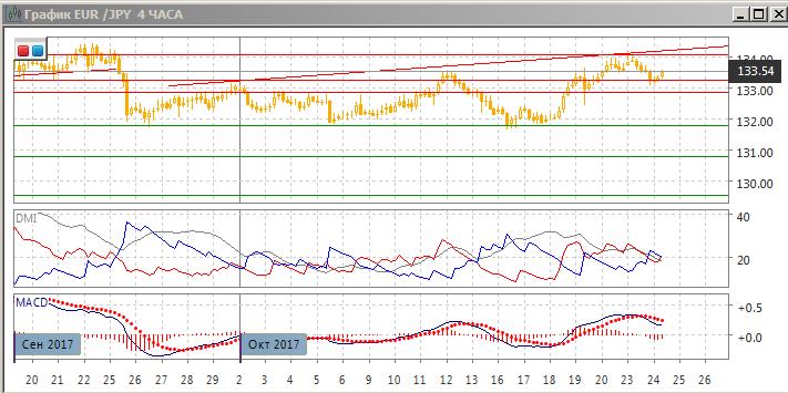 На четырёхчасовом графике пара преодолела уровень предыдущего относительного минимума. По индикаторам направленного движения снижение стало слабой тенденцией: DM- немного выше DM+, гистограмма MACD в отрицательной зоне, линия MACD развернулась вниз. Краткосрочно снижение кажется также предпочтительным, с тестированием поддержки на 132,90.