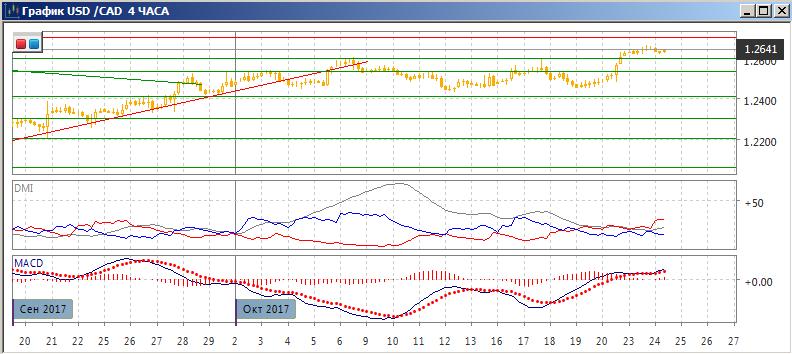 На четырёхчасовом графике пара выросла из диапазона 1,2415 — 1,2600 вверх. Исходя из ширины диапазона, рост на 150 пунктов, целью роста, исходя из измеренного движения может быть уровень 1,2750. Тем роста остаётся умеренным — превышение DM+ над DM- остаётся умеренной. Образовалось медвежье расхождение максимумов пары и гистограммы MACD, что увеличивает вероятность отката. Поддержки можно ожидать на 1,2600.