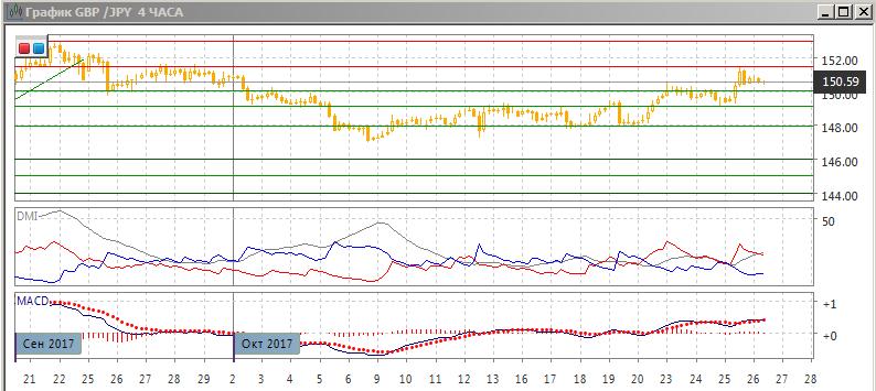 На четырёхчасовом графике пара после закрепления выше уровня 149,15 и возвращения к этому уровню 24 октября получила там поддержку и резко выросла. Выход из диапазона середины октября вверх предполагает более высокой вероятность дальнейшего роста пары. Относительные максимумы и минимумы пары сейчас растут, по ADX тенденцией является рост: DM+ выше DM- при росте ADX. По гистограмме MACD новый максимум не был подтверждён, что делает возможным откат к уровню поддержки на 150.