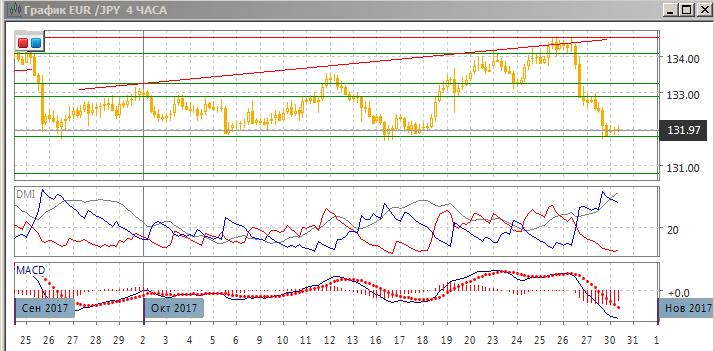 На четырёхчасовом графике можно построить расходящийся треугольник с 26 сентября. Пара достигла нижней границы, и на этом уровне поддержка может быть сильной. Так как отскок от этого уровня небольшой и образуются свечи «дожи» вместо коррекции, скорее снижение будет продолжаться с преодолением уровня 131,80. По индикаторам направленного движения снижение является сильной тенденцией: превышение DM- над DM+ значительное при росте ADX, линия MACD имеет отрицательный наклон, гистограмма MACD в отрицательной зоне. Вероятно, уровень 131,80 будет тестироваться, и при закреплении ниже 130 возможно существенно снижение, с ближайшей целью на 130,80.
