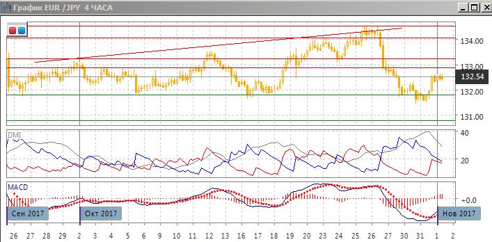 На четырёхчасовом графике видно, что отскок от 131,80 приостановился около 132,50. Пара преодолела уровень предыдущего относительного максимума, но остаётся ниже сопротивления на 132,90 (окон не раз проявлялось с конца сентября). Если предполагать, что текущий отскок является коррекционным к волне снижения с 26 октября, более вероятным видится возвращение к уровню 131,80.