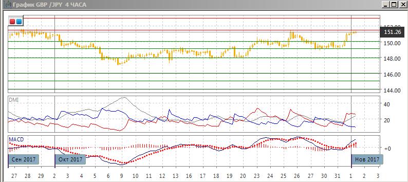 На четырёхчасовом графике пара достигла уровня предыдущего максимума у 151,50 и стоит дождаться, будет ли на этом уровне разворот вниз (и потенциальное образование двойной вершины), или пара будет двигаться дальше к максимуму сентября около 153. По индикаторам направленного движения ситуация близка к имевшейся 25 октября, но нет медвежьего расхождения максимумов пары и гистограммы MACD. При снижении от 151,50 целью будет видеться уровень 149,15 — около него много максимумов и минимумов с начала октября.