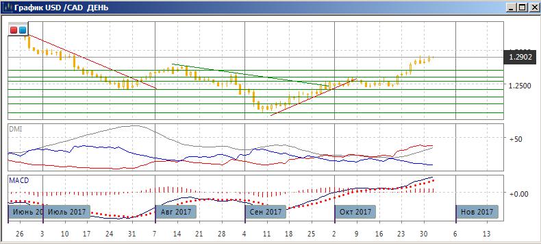 На дневном графике в целом тенденция не изменилась — рост остаётся для пары хорошо выраженной тенденцией, по ADX тенденция усиливается: превышение DM+ над DM- увеличивается, линия ADX растёт. Подтверждение сохраняется по линии MACD (положительный наклон) и гистограмме MACD (находится в положительной зоне). Пара остаётся выше максимума августа, и стоит ожидать продолжение роста до следующего сильного сопротивления — психологически важного уровня 1,30. Также в сторону продолжения роста то, что образование свечей с верхними тенями не завершилось откатом вниз.